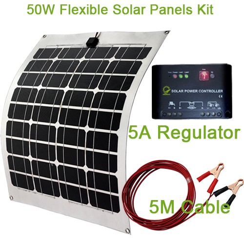 50W semi-flexible Mono Solar Panel+ 5 A solar regulator,5m cable with battery clips